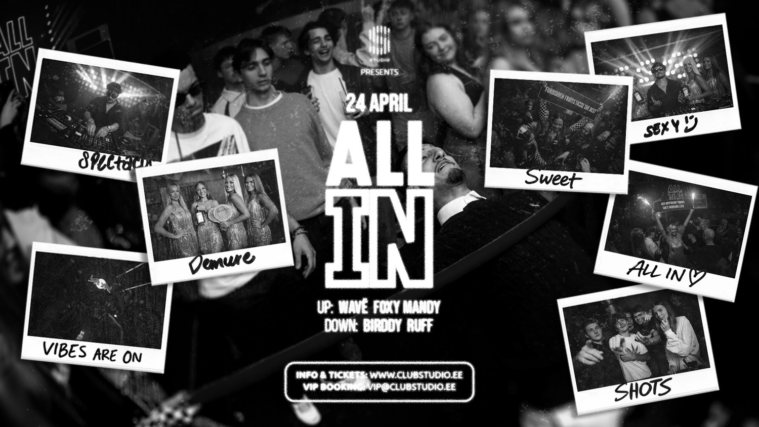 Loomulikult on kohal #AllIn meelelahutajad, kes õhtu sulle meeldejäävamaks muudavad... Igal täistunnil Shotiralli, confetti kahurid ja mõned asjad jätame üllatuseks ka.